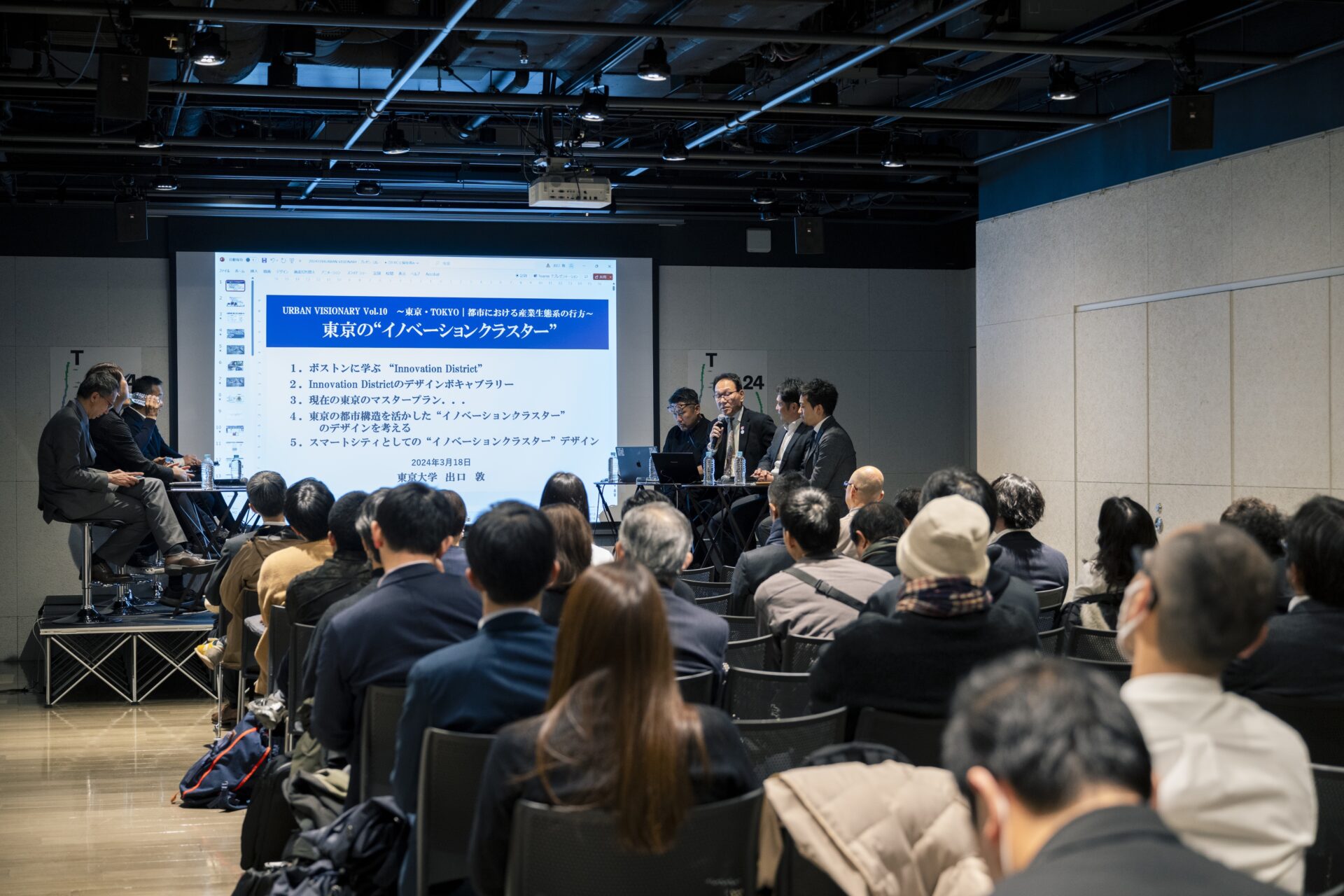 司会進行をつとめたのは、パノラマティクスの齋藤精一さん。齋藤さんと同じく初回から参加する建築家の豊田啓介さん、リージョンワークスの後藤太一さん、事業者として東急の山口堪太郎さん、三井不動産の佐々木誠さん、三菱地所の雛元昌一郎さん、森ビルの中裕樹さんが登壇しました。そして初参加となる東京大学副学長・大学院新領域創成科学研究科教授の出口敦さんを迎え、東京の産業生態系について深堀りする意見を出し合うことで、まちづくりの捉え方や方策について議論を深め横断的なアクションを提言する回となりました。